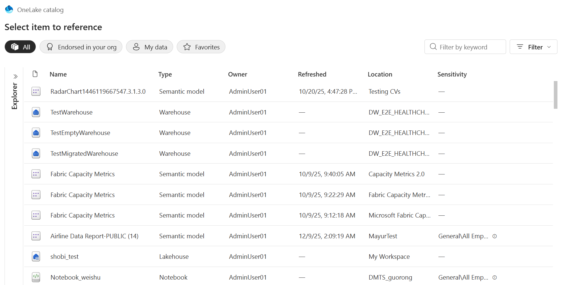 - This will open a dialog to select the desired item. You'll see all of the items that you have permissions on, available for selection. Use the explorer on the left to filter the list by workspace. Use the filter in the top-right corner to filter by type.