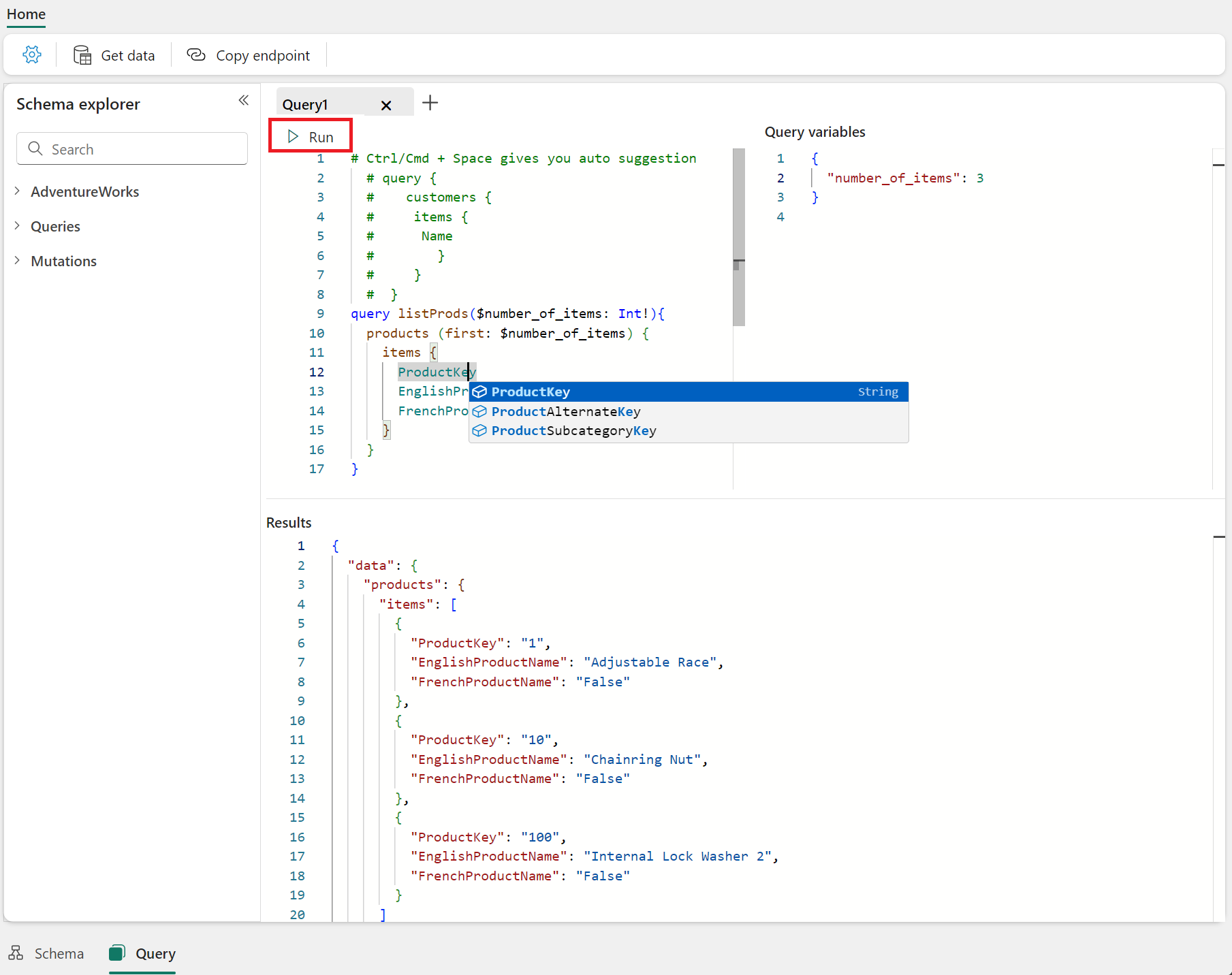 Type and execute GraphQL queries directly on the Query tab. Intellisense capabilities are available with a keyboard shortcut: CTRL + Space (Windows), or Command + Space (macOS). Select Run to execute the query and retrieve data from the data source.