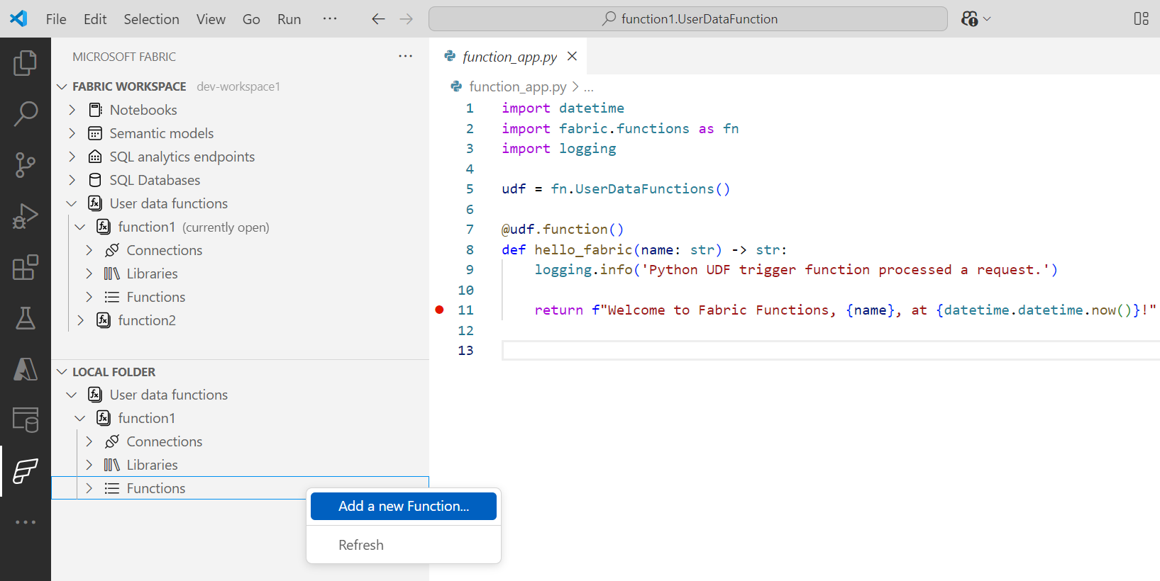 Select F5 to debug your Fabric functions. You can add a breakpoint anywhere in your code. In debug mode, your breakpoints are hit as expected and test your code as you would test a deployed function.