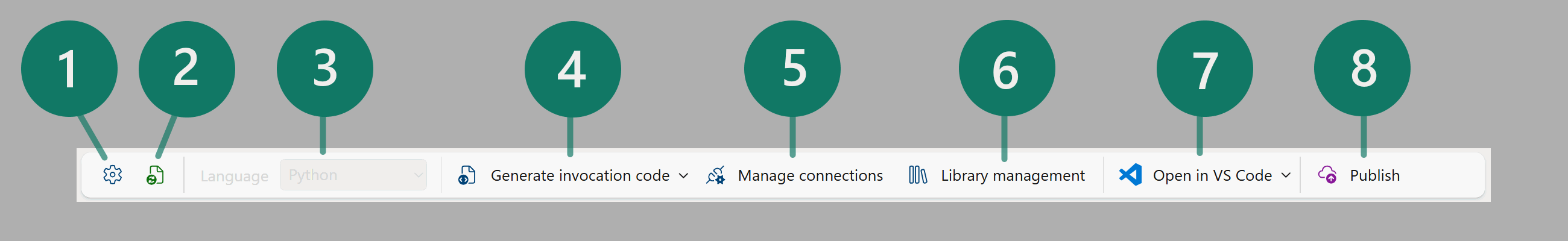 - Publish button: This button starts the publish process for your User Data Functions item. This process publishes all functions in your item. After your functions are published, other users and Fabric items can run your functions.