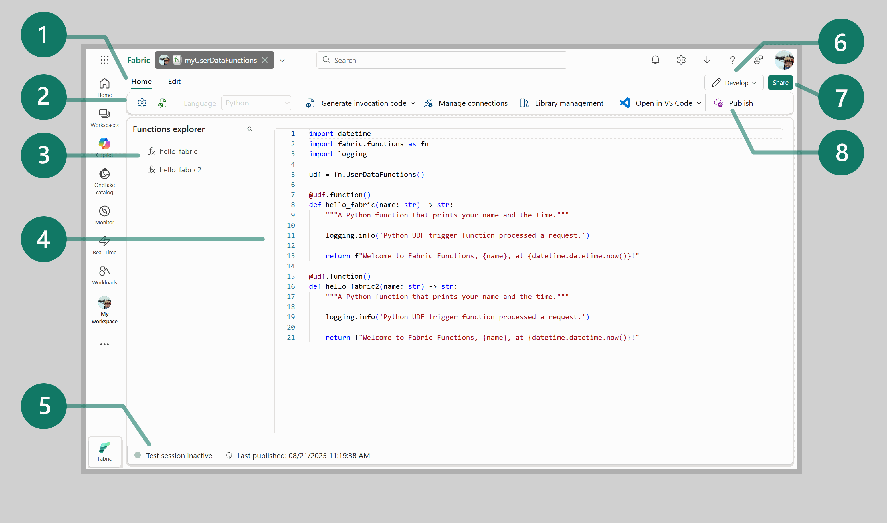 - Generate invocation code: This feature automatically generates code templates for calling your functions from external applications or Fabric items. Learn more about generating invocation code.