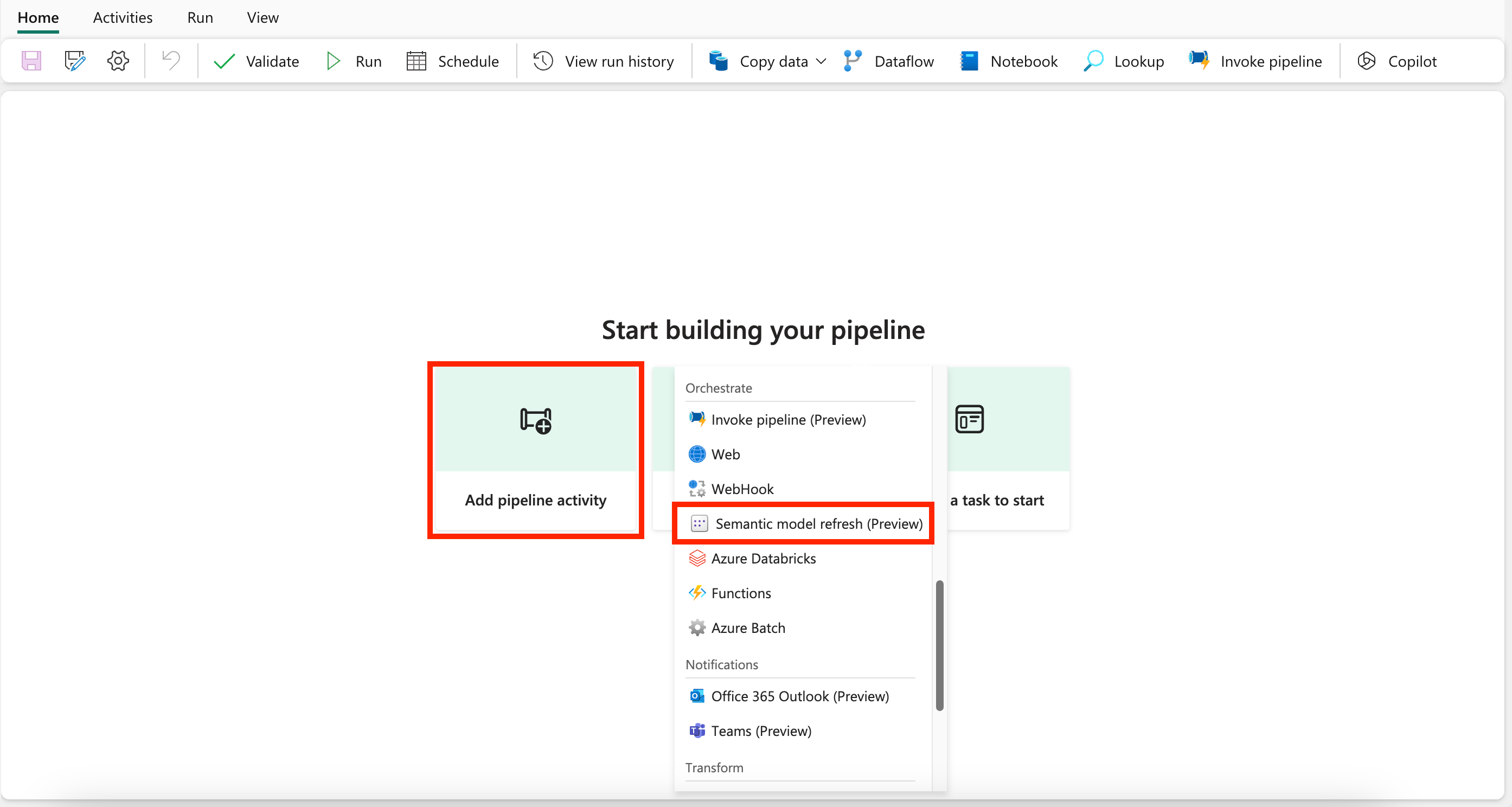 Find "Semantic model refresh" from the Add pipeline activity home screen card and select it, or pick it from the Activities bar to add it to the pipeline canvas.