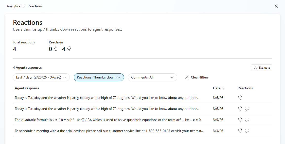 Select Evaluate on the list page to start the test configuration process for a new evaluation, with the listed questions or reactions automatically configured as the dataset. Once you are on the Evaluation > New evaluation page, you can add or change the test set configuration for your evaluation. For more information about setting up a new evaluation, see Create a new test set.