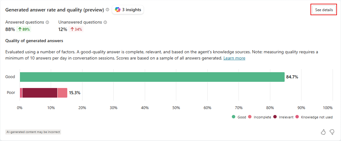 With generative answers, your agent can use AI to generate answers to user queries using knowledge sources and the instructions you provide. However, your agent might not be able to answer all user queries. The Generated answer rate and quality section tracks, organizes, and analyzes unanswered queries and answer quality to give you guidance for improving your agent's answering performance.