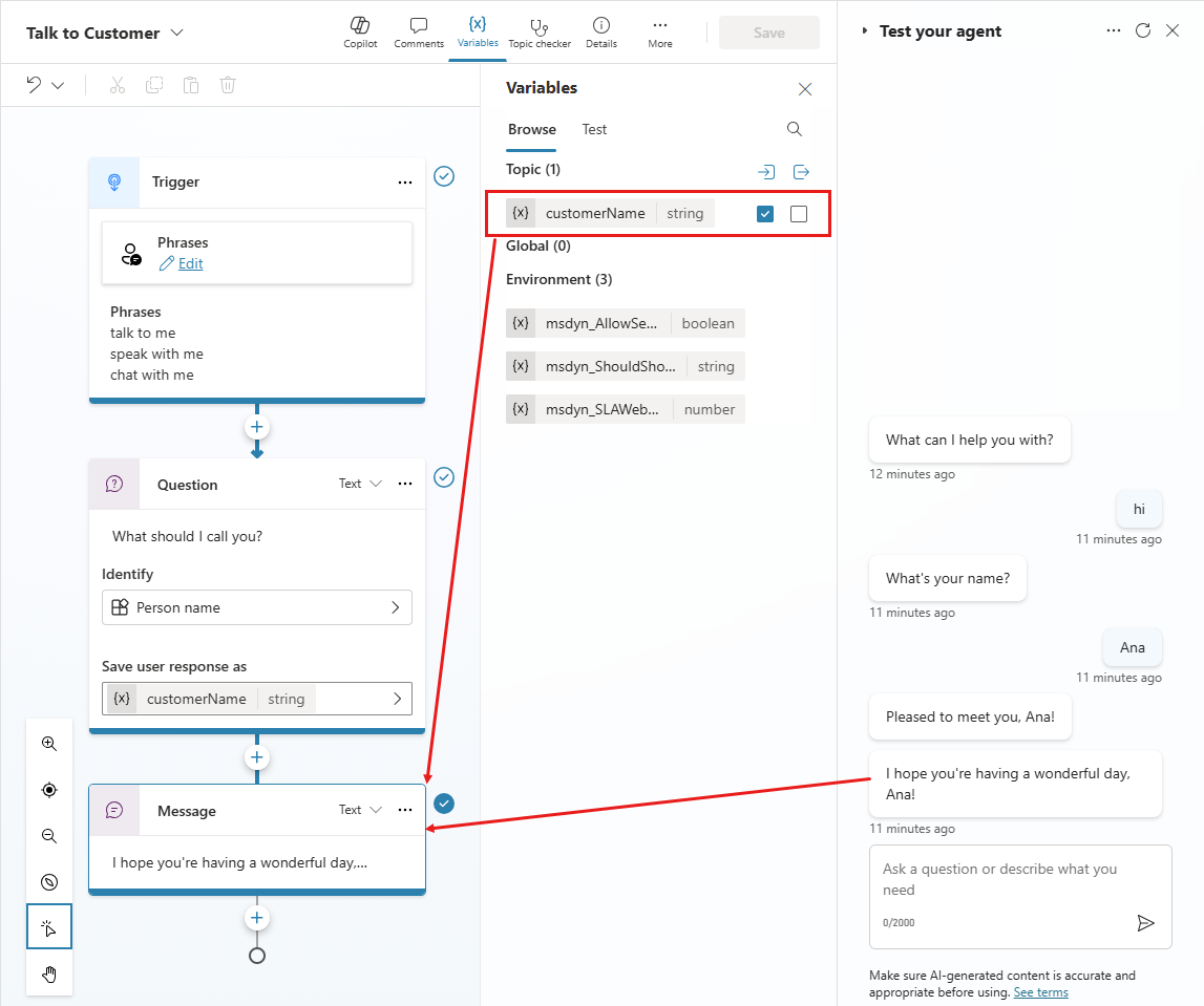 As shown in the test panel, if this topic is triggered first, it asks the user, "What's your name?" It stores the value in a string variable called customerName. The topic sends the message, "Pleased to meet you, customerName!" It then redirects to the Talk to Customer topic, which sends the message, "I hope you're having a wonderful day, customerName!" Note, however, that the Talk to Customer topic skipped asking for the user's name again. Instead, it used the value of the customerName variable passed from the Greeting topic.