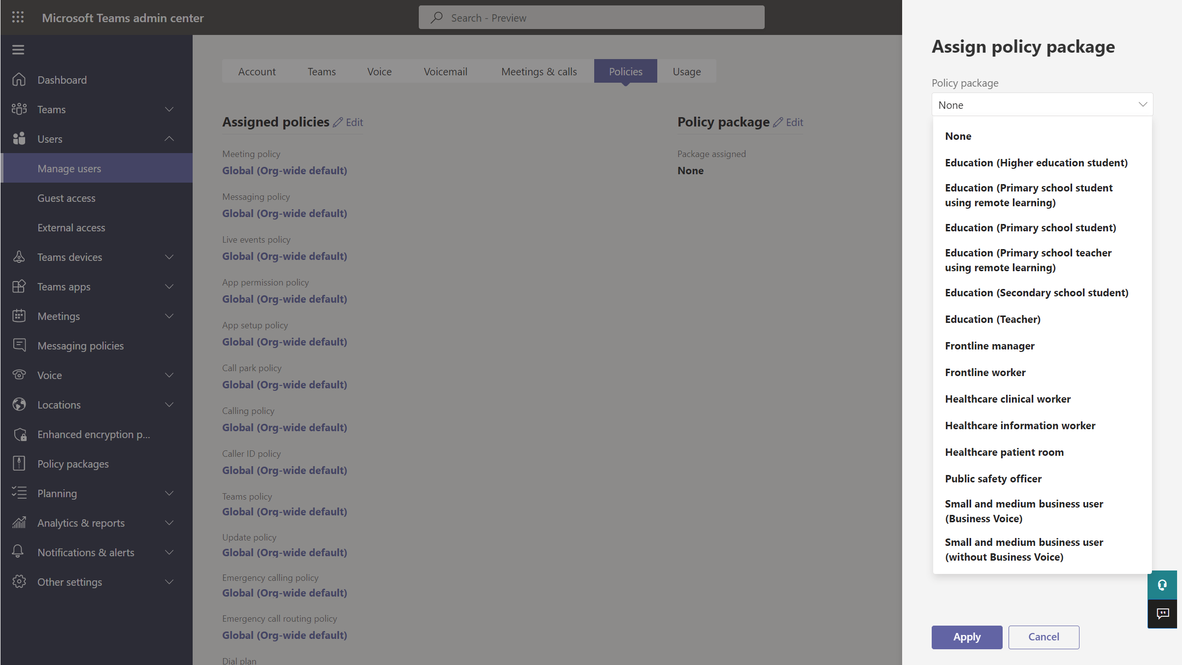 A policy package in Teams is a collection of predefined policies and policy settings that you can assign to users who have the same or similar roles in your organization. Each policy package is designed around a user role and includes predefined policies and policy settings that support activities typical for that role. Some examples of policy packages are the Education (Teacher) package and Healthcare (Clinical worker) package. To learn more, see Manage policy packages in Teams.