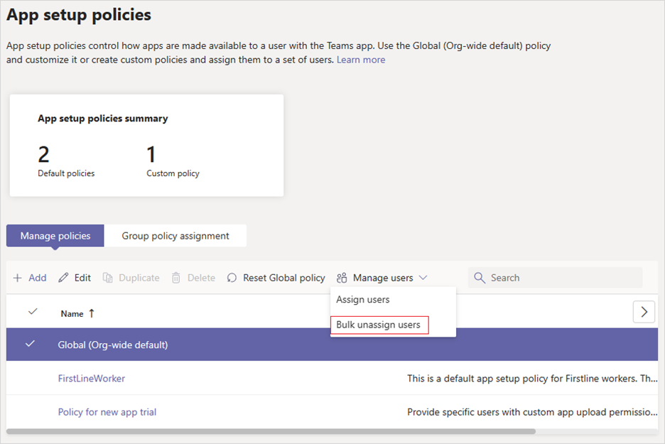 When you unassign policies in bulk, you're removing policy assignments that were assigned to individual users through direct assignment. To unassign setup policies in bulk, follow these steps: