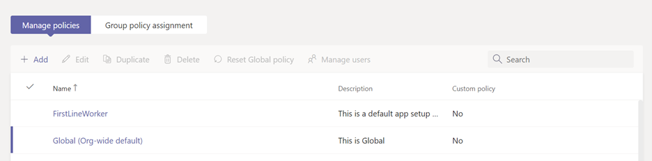 FirstlineWorker: This policy is for Frontline Worker. The policy can't be customized. You can assign it to Frontline Workers in your organization.
