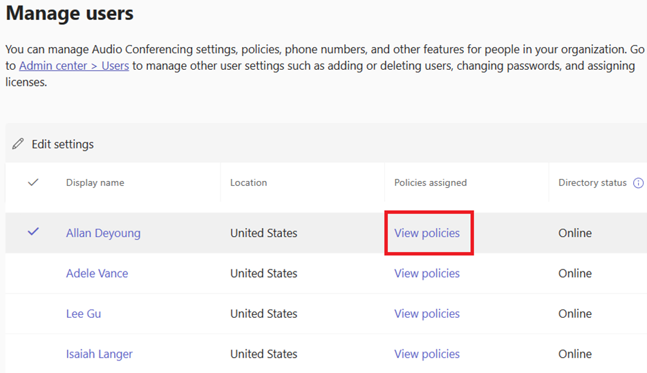 Sign in to the Teams admin center and go to Users >Manage users.
