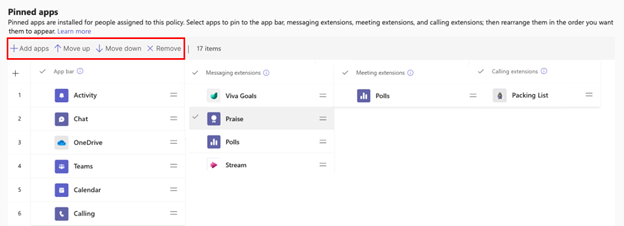 Arrange the agents and apps in the order that you want them to appear in the Teams client. You can change the sequence independently under App bar, Messaging extensions, Meeting extensions, and Calling extensions. You can remove agents and apps from a scope.