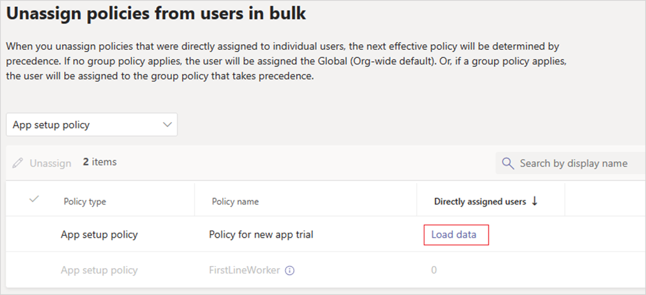 Choose the policy that you want to unassign and select Load data to get the number of users who are currently assigned to that policy.