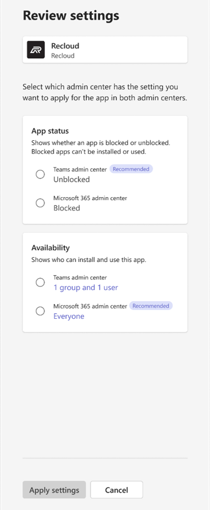 Individual app-alignment: Select any individual app and review the App status and Availability. Go to Review settings for the selected app to check the App status and Availability. Select the admin center’s settings that you want to apply from the Apply settings from drop-down list and select Apply settings.