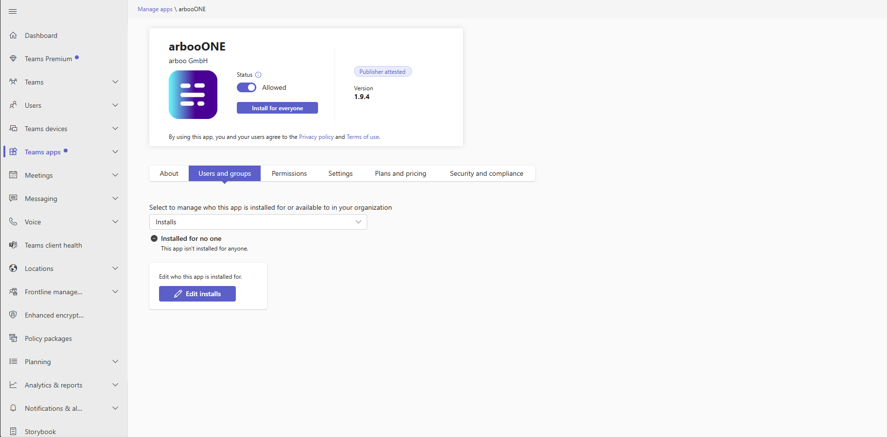 The Users and groups tab opens, which shows the actual number of users for whom the selected app is installed. Select Edit installs to install the app for selected users or install it for everyone to increase adoption.