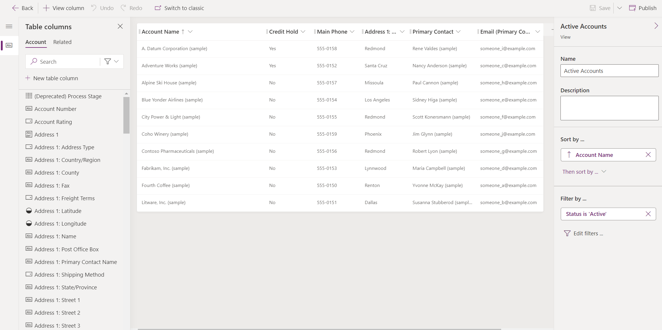 The records that are visible in views are displayed in a list. Views frequently provide options for users to change the default sorting, column widths, and filters to more easily find the data that's important to them.