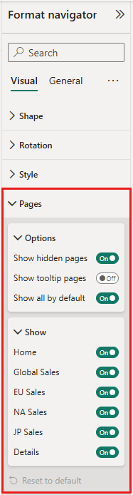 If you want to further customize the pages that appear in the page navigator or are hidden, go to the Format navigator pane. Under Pages, adjust the settings for showing hidden pages and tooltip pages: