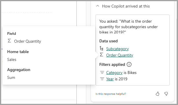 You can expand the “How Copilot arrived at this” dropdown to learn more about how Copilot understood your question, and to ensure the correct fields, measures, or filters were chosen from your model.