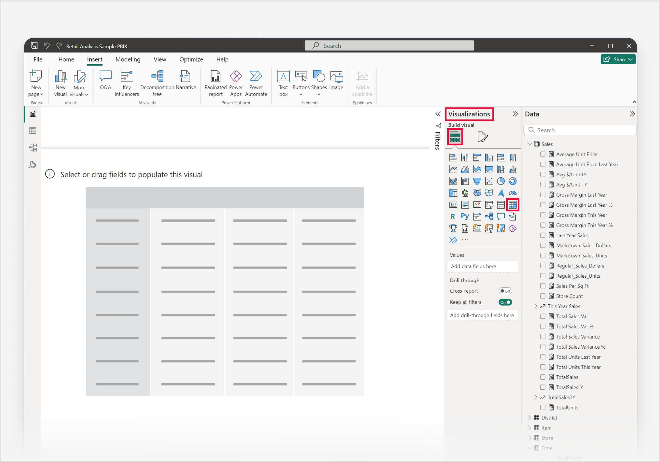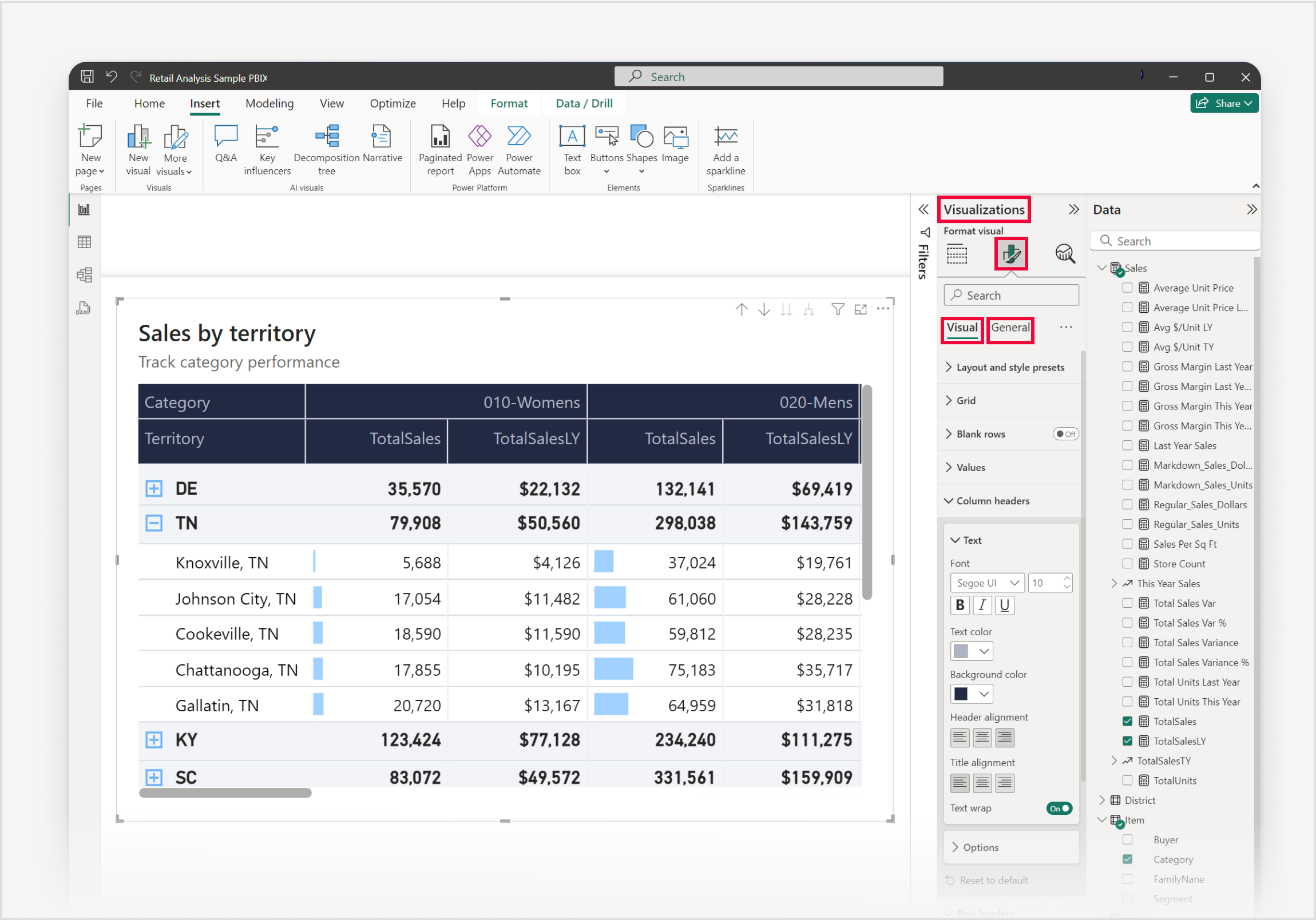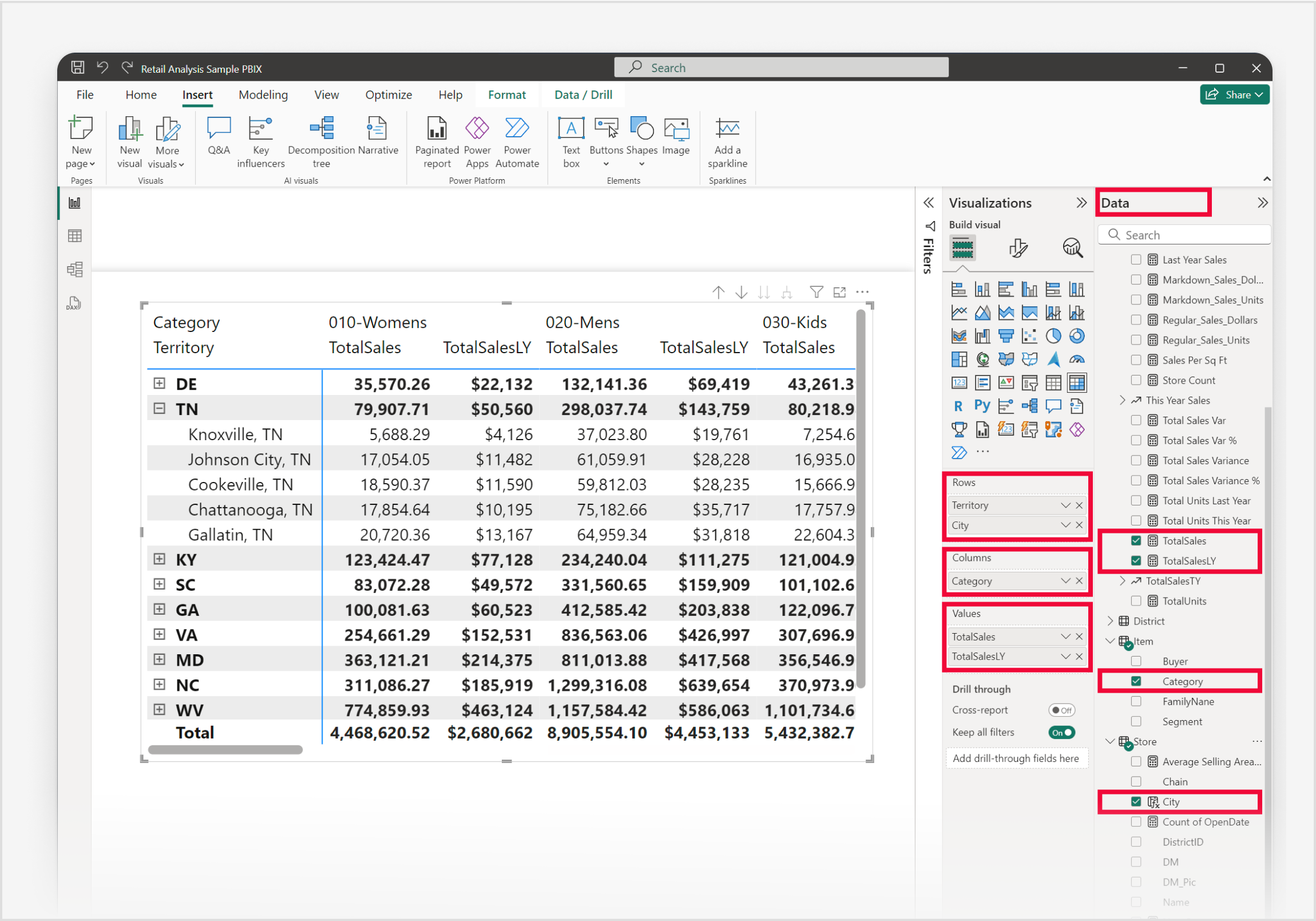 To add data to the visual in this example, let's use the Data pane. Adding data can be done by selecting fields and measures, or dragging fields and measures to the field wells on the Visualizations pane, or dragging fields and measures directly to the visual placeholder in the report canvas. Expand the Sales group, to add TotalSales and then TotalSalesLY to the Values field well. Expand the Item subgroup, to add Category to the Columns field well. And finally, expand the Store subgroup to add Territory and then City to the Rows field well.