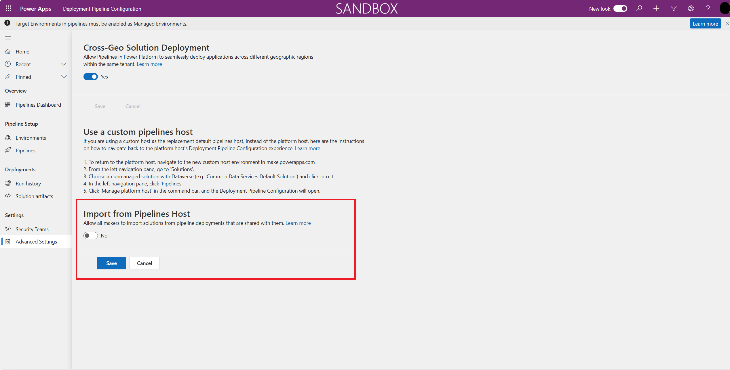 When selecting Import solution from the command bar on the Solutions page in Power Apps (make.powerapps.com), you can choose Pipelines as a source if the current environment is associated with a pipelines host.