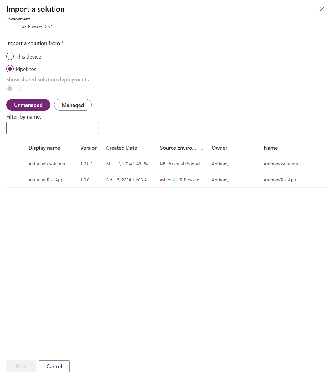 The list of solutions is generated by reading the deployment artifacts that you own as the deployer, separating managed solutions and unmanaged solutions as both are stored in the host. Users can toggle between Unmanaged and Managed to choose the appropriate solution type they would like to import.