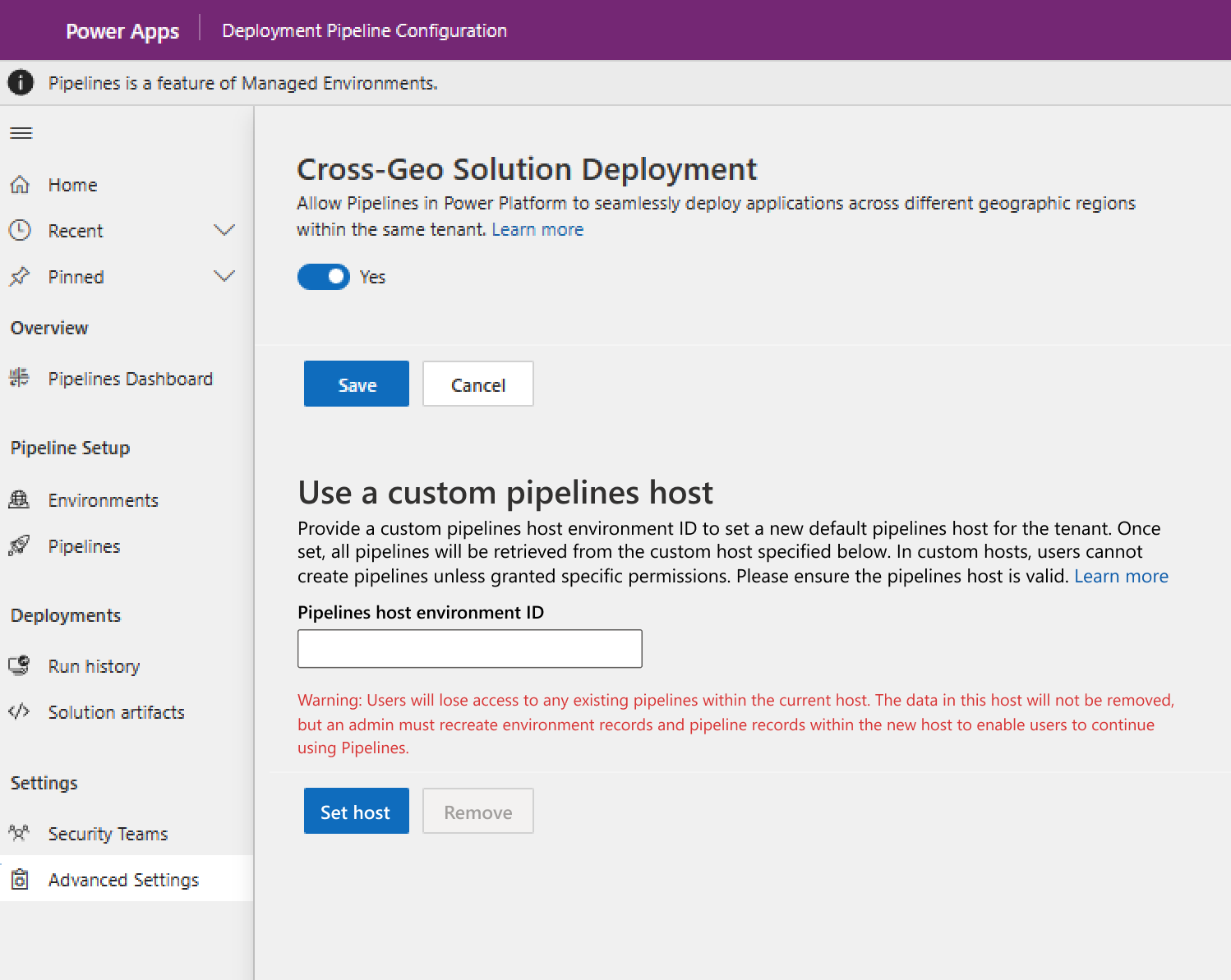 After you enable the setting, users lose access to any existing pipelines within the current host. The data in this host is not removed, but an admin must re-create environment records and pipeline records within the new host to enable users to continue using pipelines. Pipelines and permissions to access them must be shared to users in the new host so they can view and deploy those pipelines.