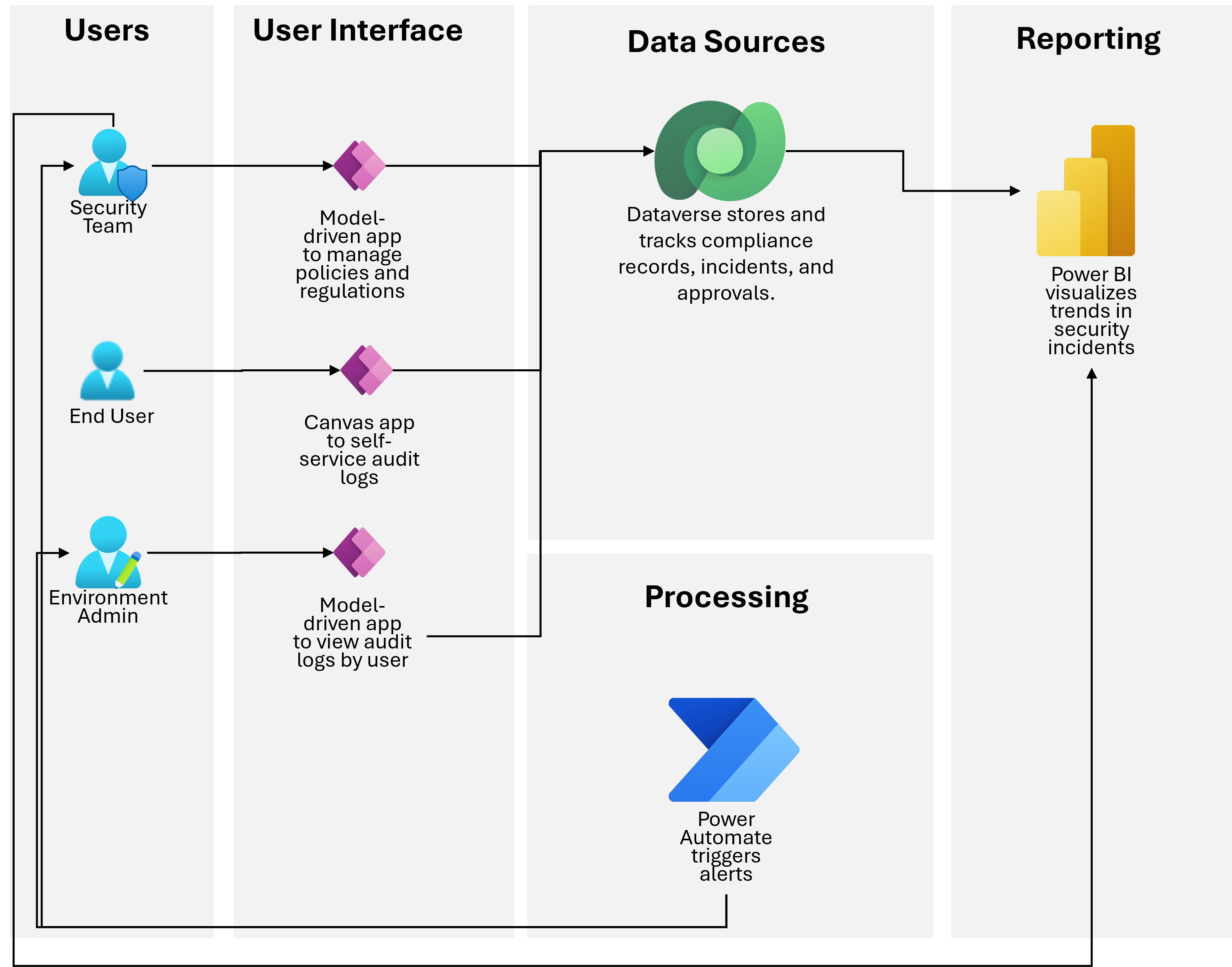 Dataverse: Serves as the central data source for security tracking. Role-based security controls access to sensitive customer and compliance data.