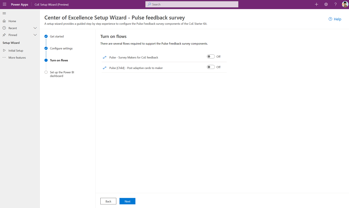 Turn on the following flows for the Pulse feedback survey components: