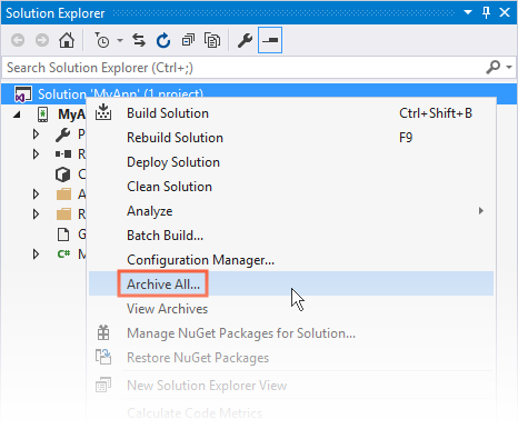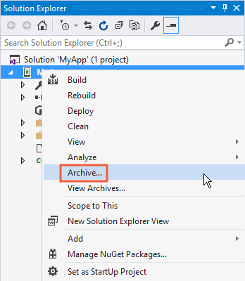 To begin the publishing process, right-click the project in Solution Explorer and select the Archive... context menu item: