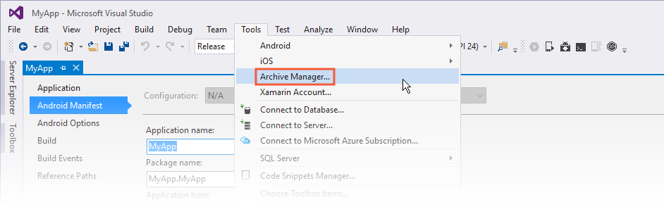 In Visual Studio, these values can be set in the Android Manifest section of project Properties, as shown in the following screenshot: