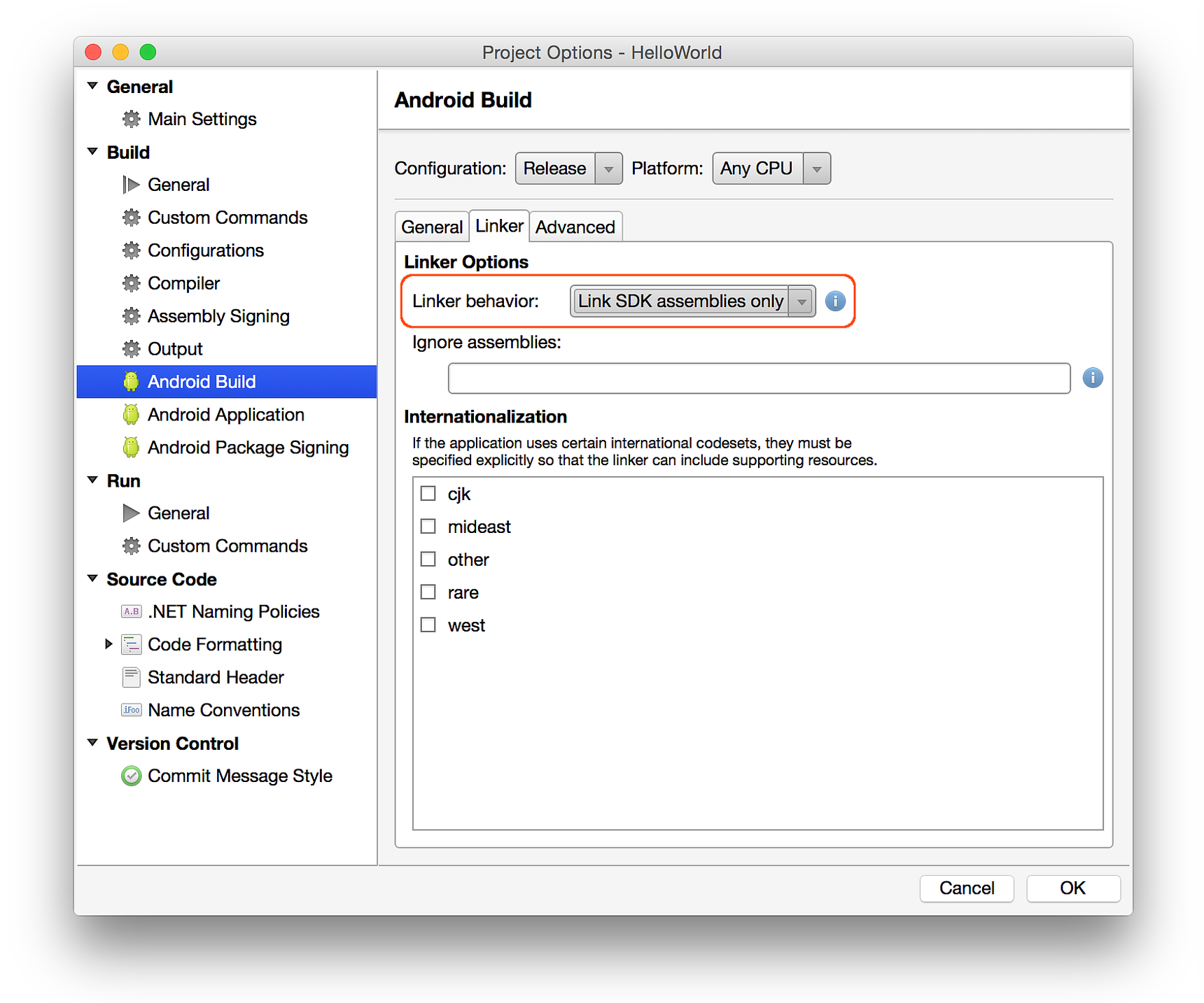SDK Assemblies Only – This will only link the assemblies that are required by Xamarin.Android. Other assemblies will not be linked.