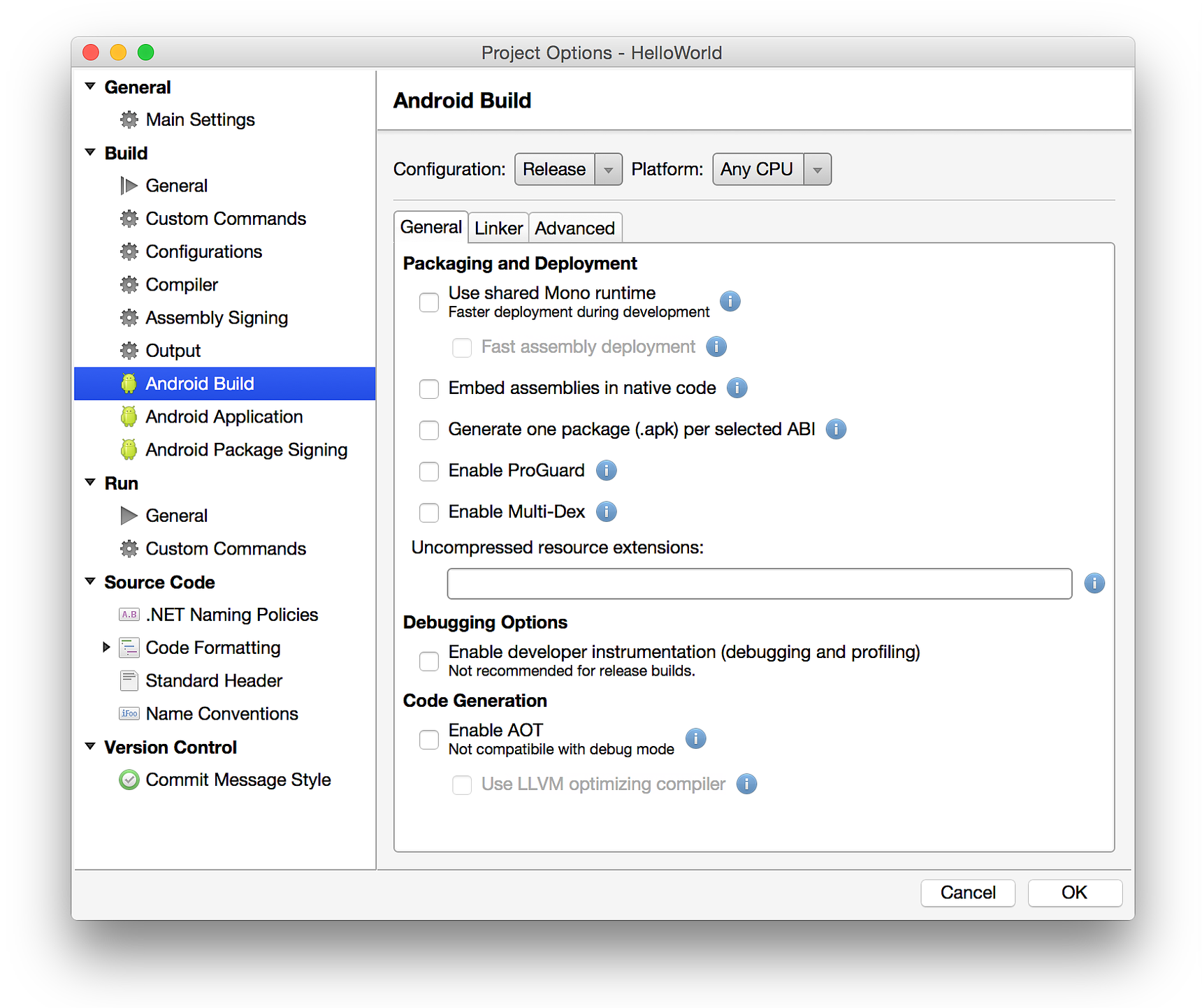 The AOT Compilation option (on the Packaging Properties page) enables Ahead-of-Time (AOT) compilation of assemblies. When this option is enabled, Just In Time (JIT) startup overhead is minimized by precompiling assemblies before runtime. The resulting native code is included in the APK along with the uncompiled assemblies. This results in shorter application startup time, but at the expense of slightly larger APK sizes.