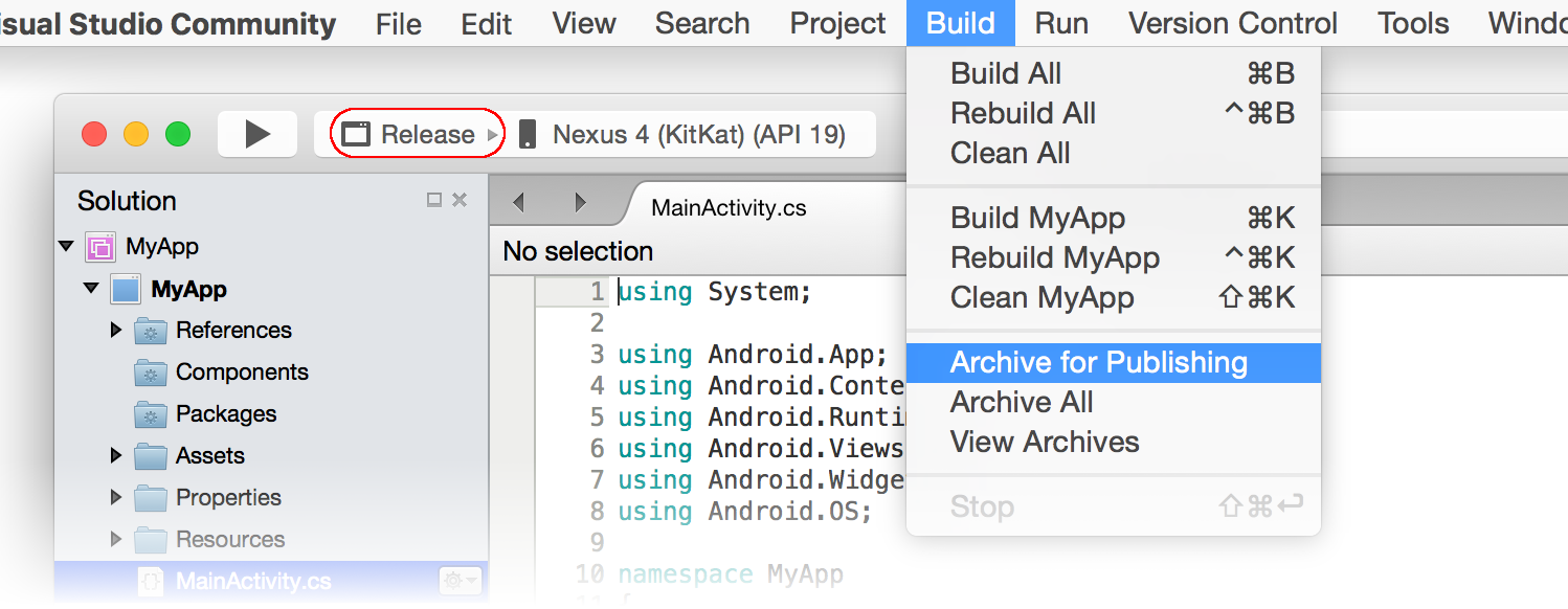 After all of the above steps are completed, the app is ready for compilation. Select Build > Rebuild Solution to verify that it builds successfully in Release mode. Note that this step does not yet produce an APK.