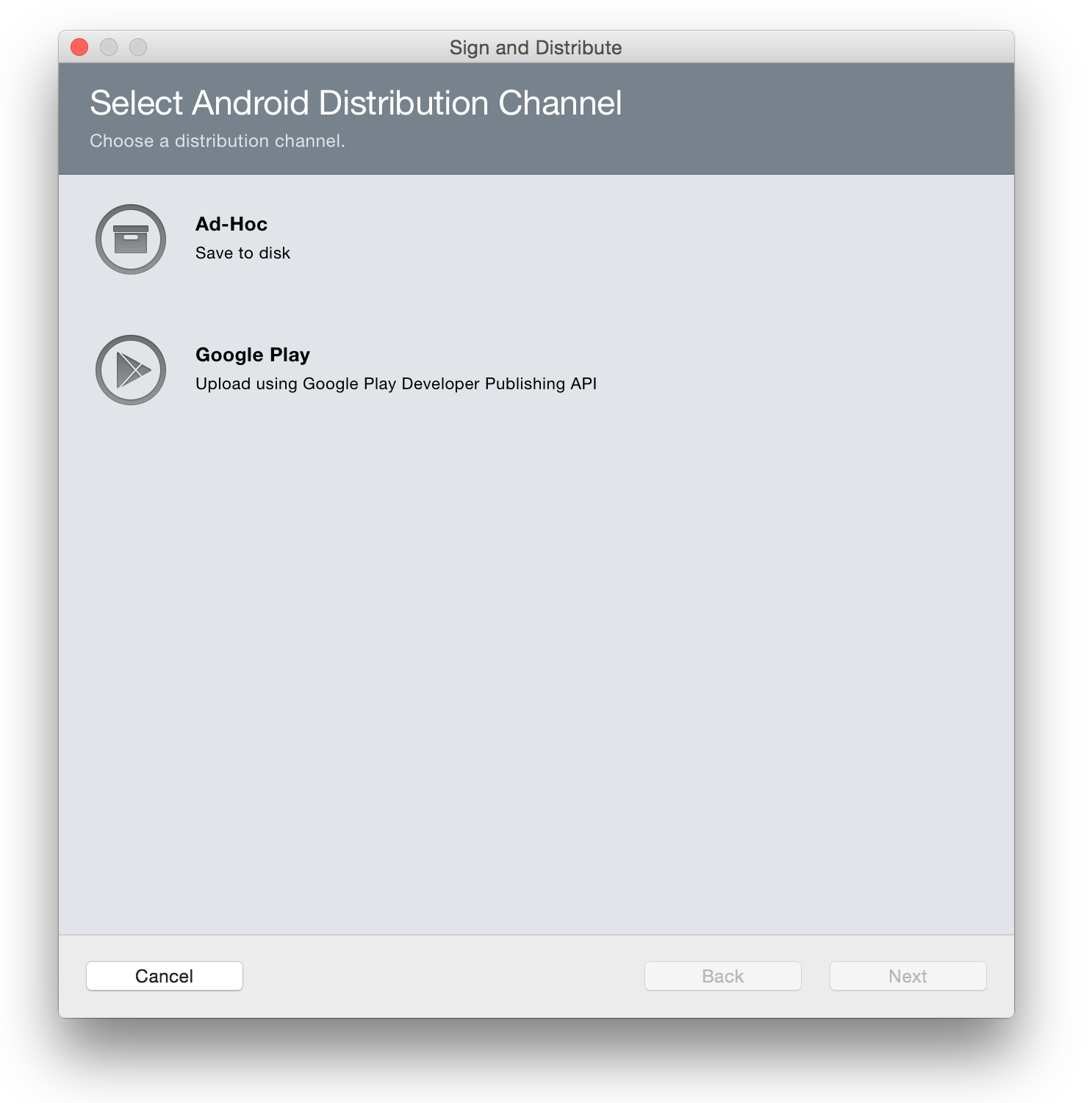 Ad-Hoc – Saves a signed APK to disk that can be sideloaded to Android devices. Continue to Signing the App Package to learn how to create an Android signing identity, create a new signing certificate for Android applications, and publish an ad hoc version of the app to disk. This is a good way to create an APK for testing.