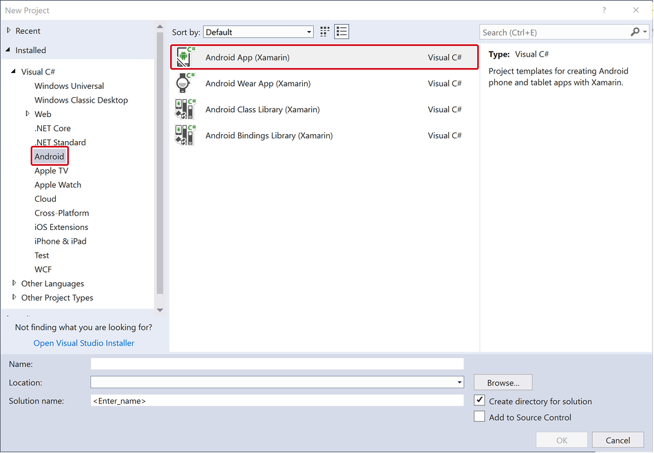 In the New Project dialog, select Android under Templates and click Android App in the right pane. Enter a name for your app (in the screenshot below, the app is called MyApp), then click OK: