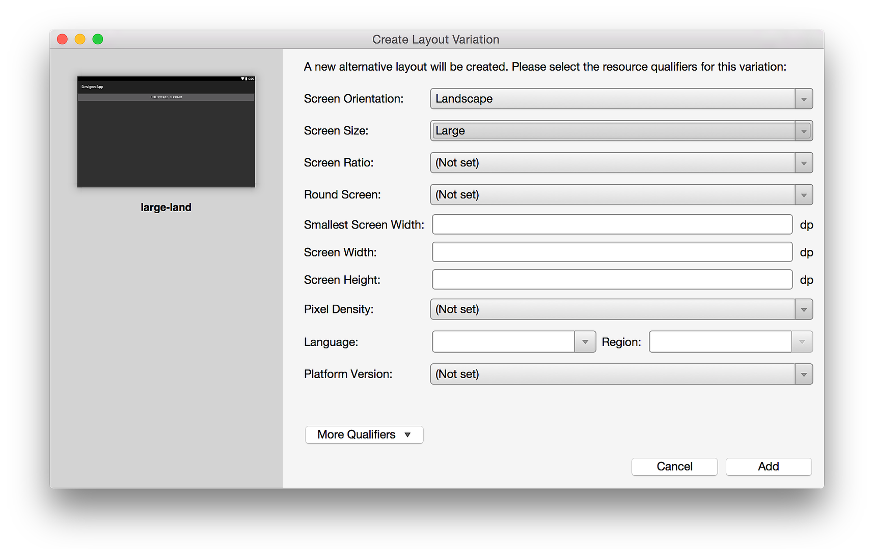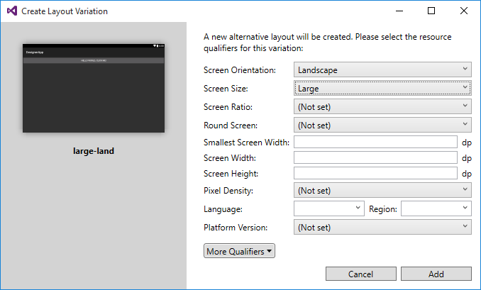 In the following example, the resource qualifier for Screen Orientation is set to Landscape, and the Screen Size is changed to Large. This creates a new layout version named large-land: