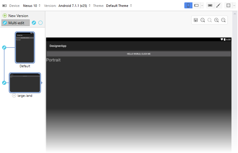 Note that the preview pane on the left displays the effects of the resource qualifier selections. Clicking Add creates the alternative layout and switches the Designer to that layout. The Alternative Layout View preview pane indicates which layout is loaded into the Designer via a small right pointer as indicated in the following screenshot:
