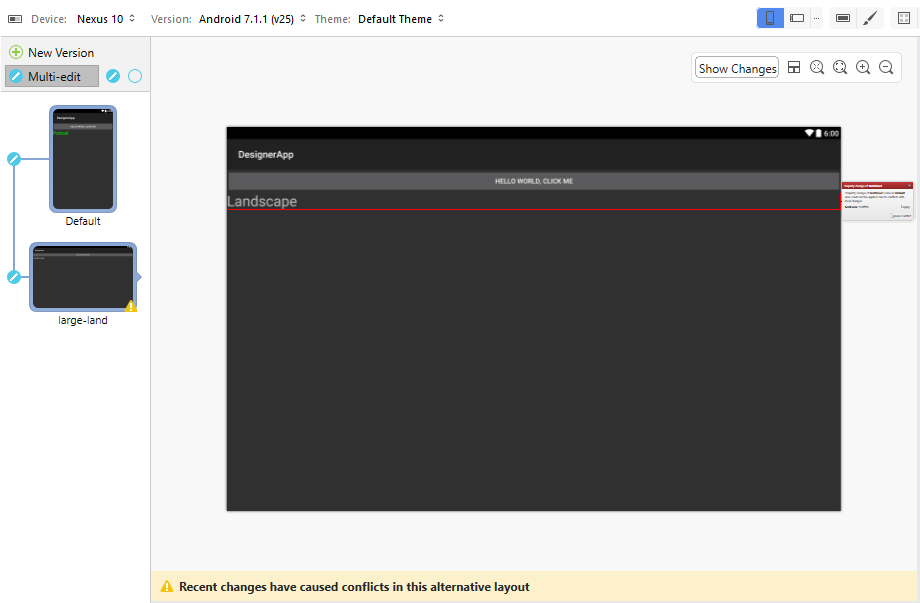 Clicking the large-land layout reveals the conflict. The following message is displayed: Recent changes have caused conflicts in this alternative layout:
