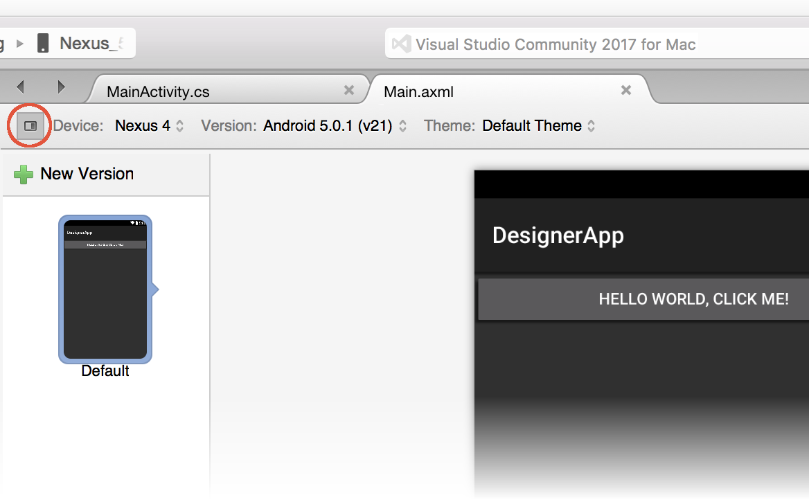 When you click the Alternative Layout View icon (to the left of Device), a preview pane opens to list the alternative layouts available in your project. If there are no alternative layouts, the Default view is presented: