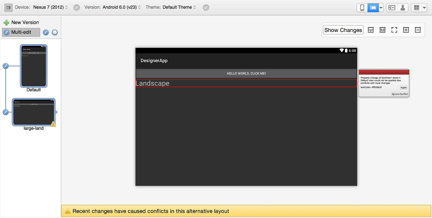 If you decide to change the color of the text in the Default layout to green, you'll see a warning icon appear on the linked layout. Clicking that layout opens the layout to reveal the conflict. The widget that caused the conflict is highlighted with a red frame and the following message is displayed: Recent changes have caused conflicts in this alternative layout.
