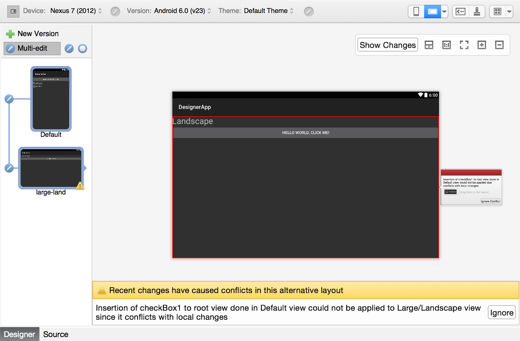 If you click Ignore Conflict, the Designer resolves the conflict, allowing the widget displayed in the conflict box to be dragged and dropped into the layout where the widget is missing (in this case, the large-land layout):