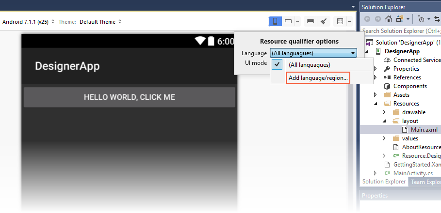 Note that if you add a new language but you do not create new resources for it, the added language will no longer be shown the next time you open the project.