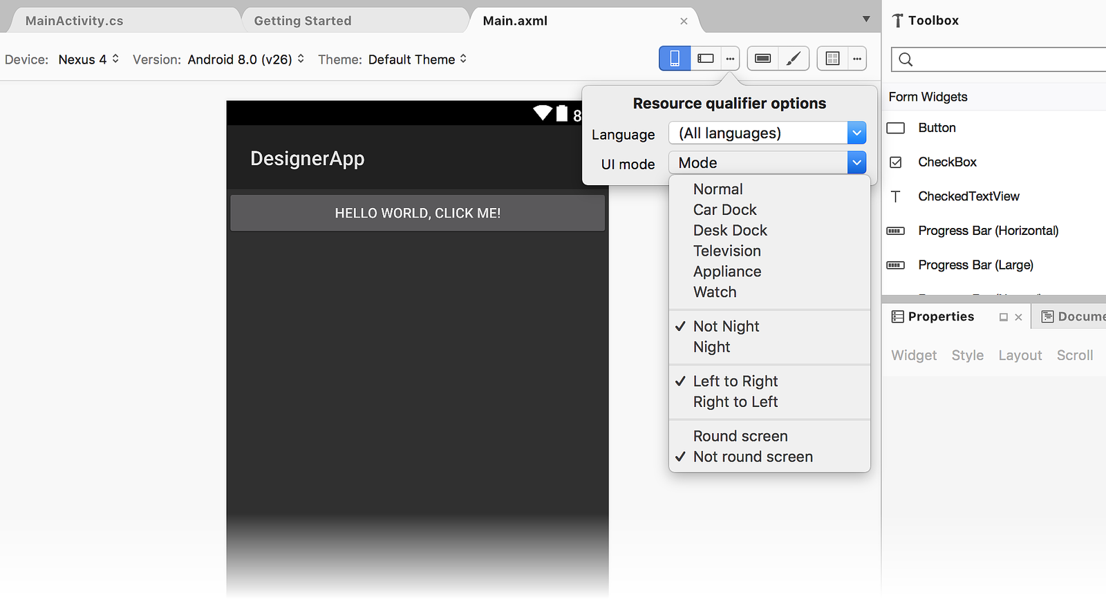 The Android Version selector sets the Android version that is used to render the layout in the Designer. The selector displays all versions that are compatible with the target framework version of the project: