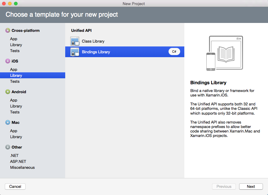 Bindings can be built for both iOS and Mac libraries. This page describes how to work on an iOS binding, however Mac bindings are very similar.