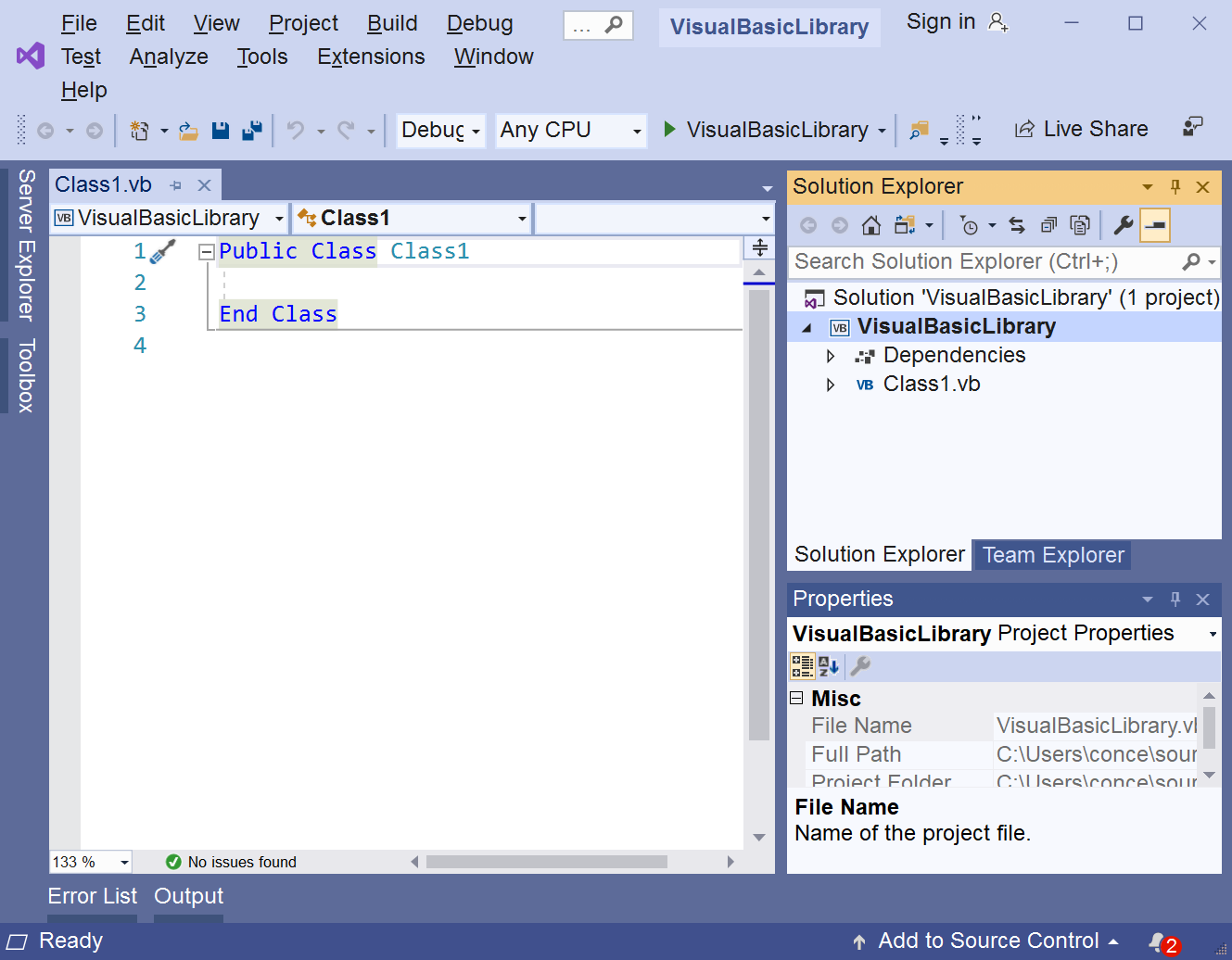 The project is now ready for Visual Basic code to be added. .NET Standard projects can be referenced by other projects (application projects or library projects).