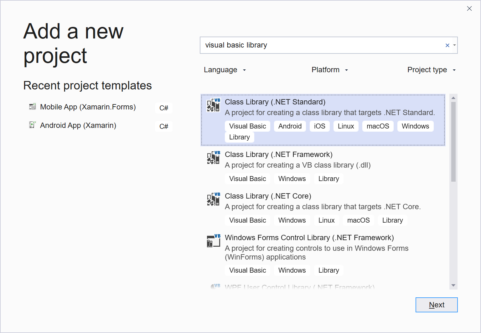 This section walks through how to create a Visual Basic .NET Standard library using Visual Studio 2019. The library can then be referenced in other projects, including Xamarin.Android, Xamarin.iOS, and Xamarin.Forms apps.