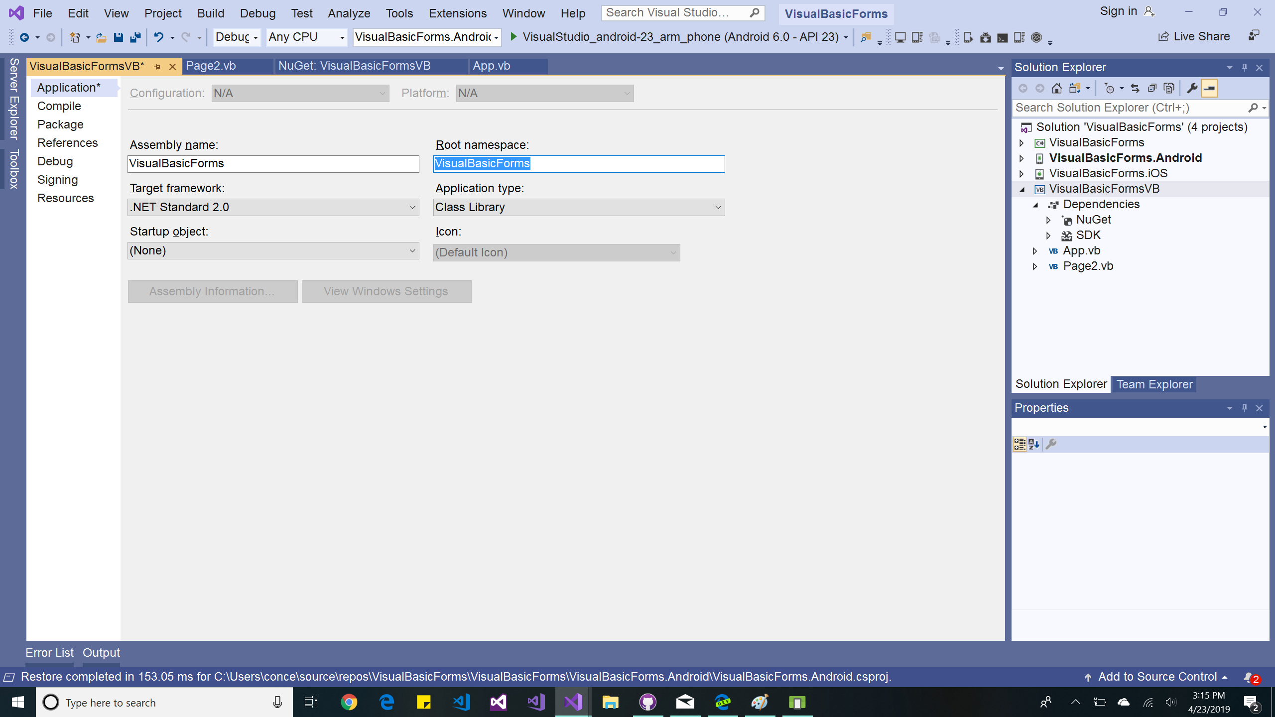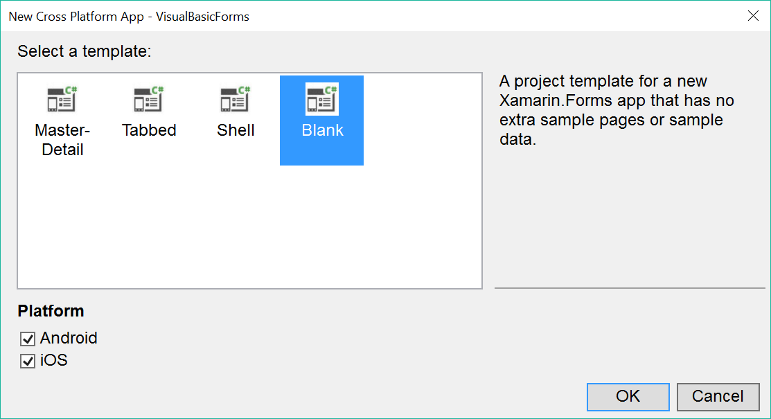 This creates a Xamarin.Forms solution in Visual Studio, using C#. The next steps modify the solution to use Visual Basic.