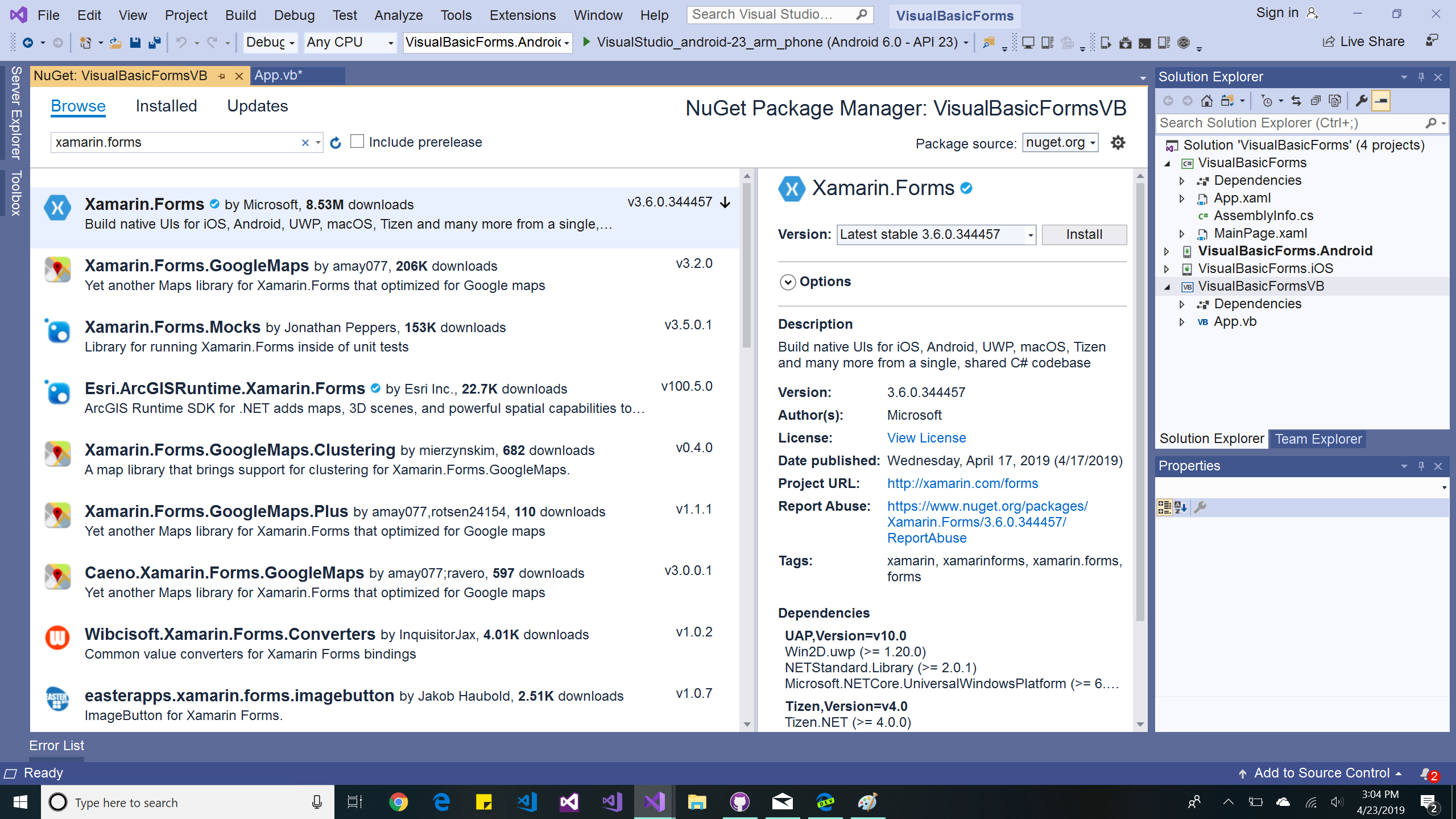 Right-click on the new Visual Basic project and choose Manage NuGet Packages, then install Xamarin.Forms and close the package manager window.