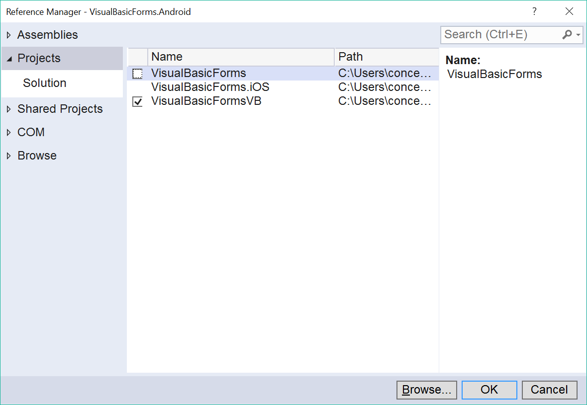 Imports Xamarin.Forms Public Class App Inherits Application Public Sub New() Dim label = New Label With {.HorizontalTextAlignment = TextAlignment.Center, .FontSize = Device.GetNamedSize(NamedSize.Medium, GetType(Label)), .Text = "Welcome to Xamarin.Forms with Visual Basic.NET"} Dim stack = New StackLayout With { .VerticalOptions = LayoutOptions.Center } stack.Children.Add(label) Dim page = New ContentPage page.Content = stack MainPage = page End Sub End ClassUpdate the Android and iOS projects so that they reference new Visual Basic project (and not the C# project created by the template). Right-click on the References node in the Android and iOS projects to open the Reference Manager. Un-tick the C# library and tick the Visual Basic library (don't forget, do this for both the Android and iOS projects).