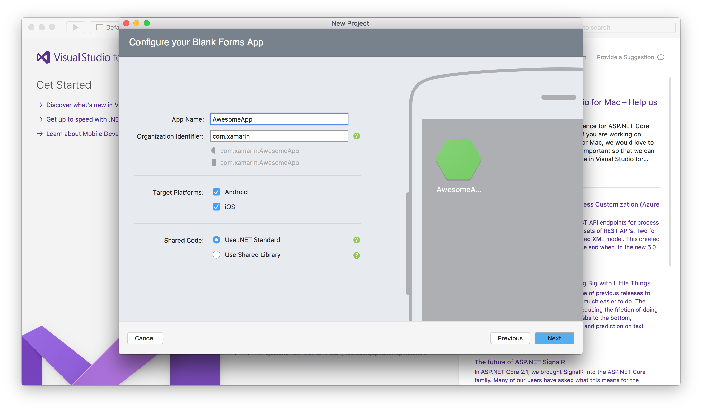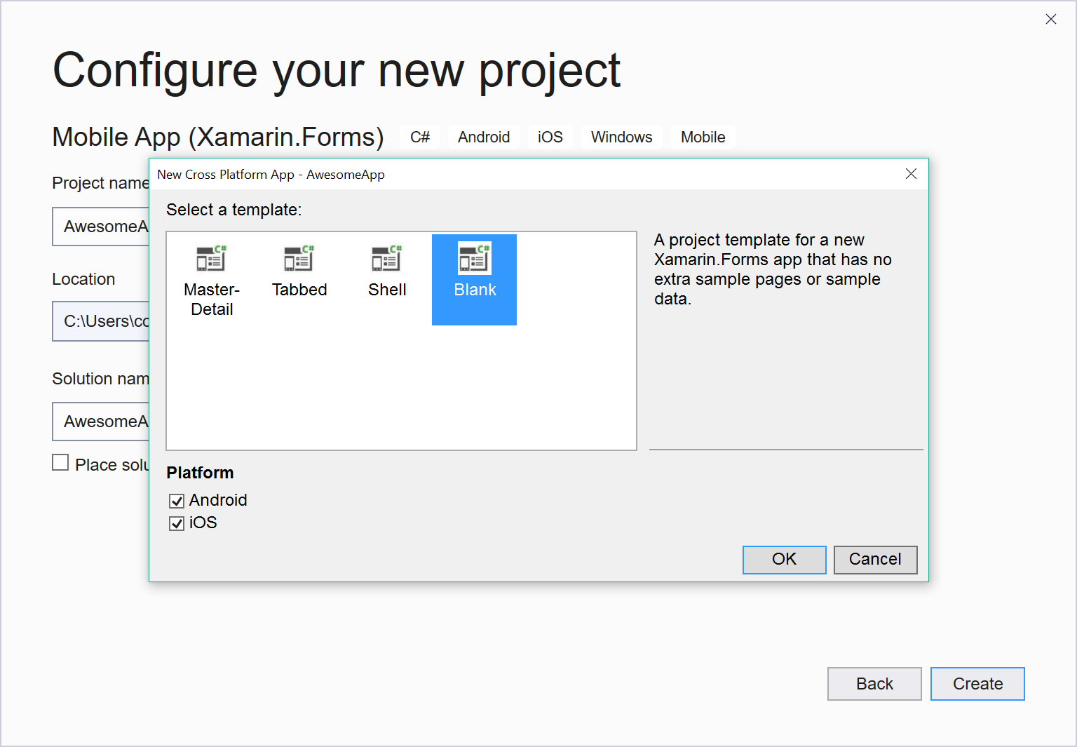 Ensure Android and iOS are selected, with .NET Standard code sharing: