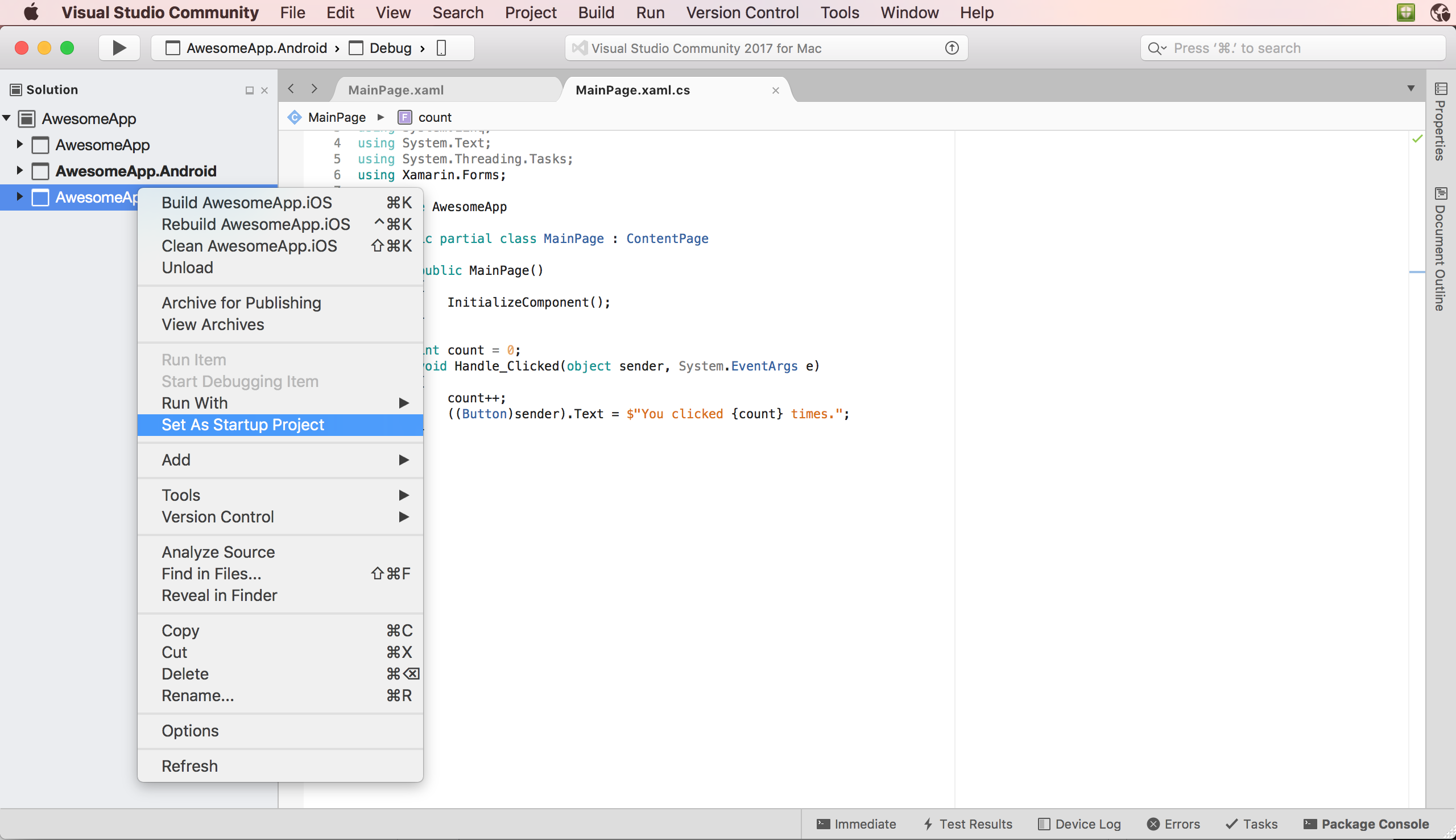 int count = 0; void Handle_Clicked(object sender, System.EventArgs e) { count++; ((Button)sender).Text = $"You clicked {count} times."; }Debug the app on Android: