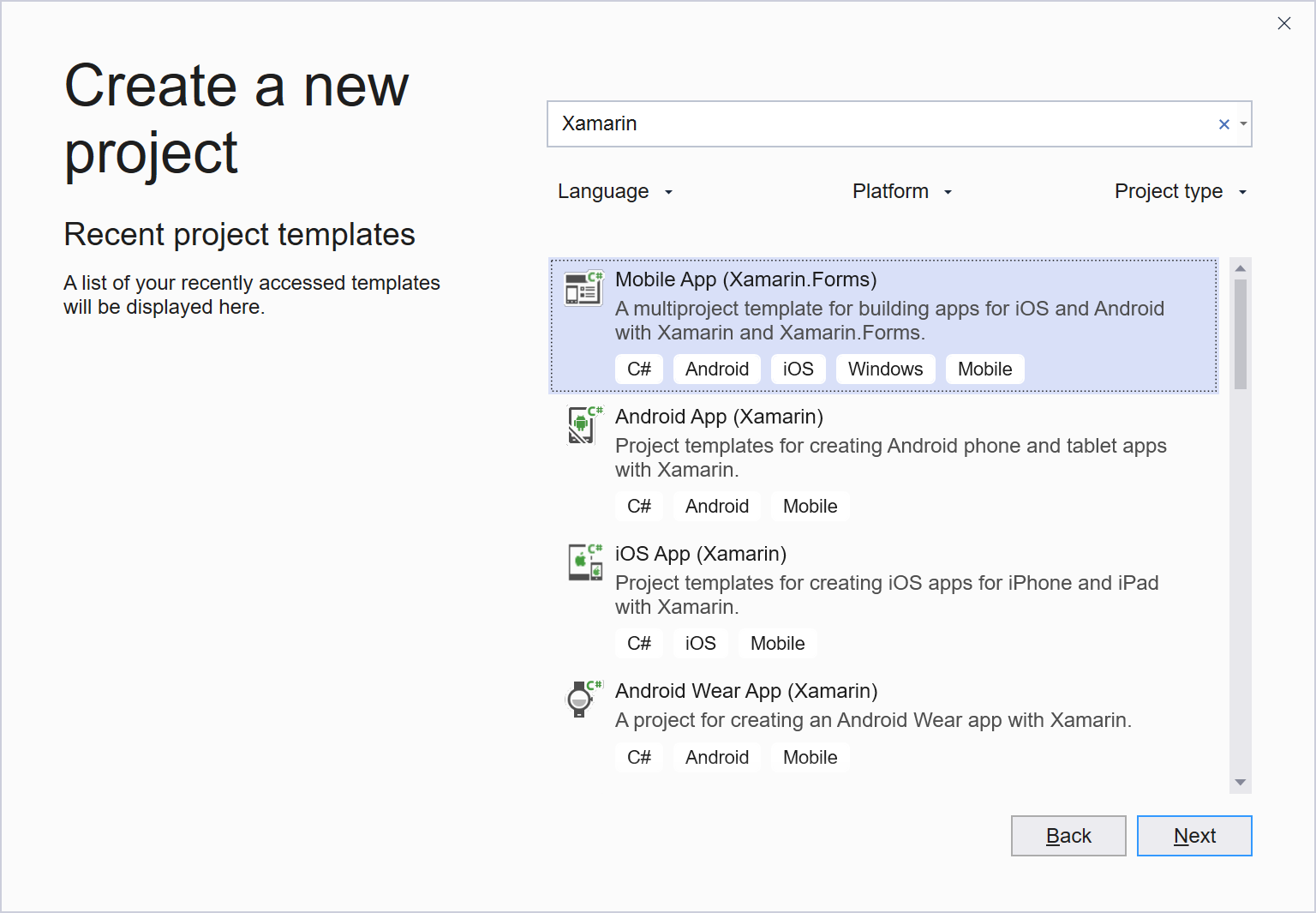Search for "Xamarin" or choose Mobile from the Project type menu. Select the Mobile App (Xamarin.Forms) project type.